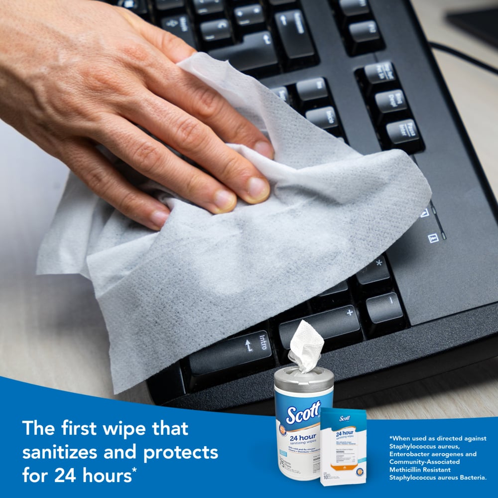 Most surface disinfectants work, but only for the moment. As soon as a surface is touched again, germs are back in action. The good news is that Scott® 24 Hour Sanitizing Wipes are the first wipes on the market to maintain surface sanitization for a full 24 hours, killing 99.9% of bacteria – even after multiple touches. Scott® 24 Hour Sanitizing Wipes clean, sanitize and disinfect, all while not requiring any rinsing. The wipes are also bleach-free. Our wipes use patented technology to create an antimicrobial defense barrier that delivers best in class 24-hour sanitization. Scott® 24 Hour Sanitizing Wipes provide disinfection of bacteria and viruses such as E.coli, S. aureus, SARS-CoV-2 the virus that causes COVID-19, influenza A virus (H1N1), and respiratory syncytial virus (RSV), and are part of the EPA List N: Disinfectants for Use Against SARS-CoV-2. Wipes are safe to use on all hard, non-porous and non-food-contact surfaces in the home, office, classroom, childcare facility and gym when used according to directions for use. For peace of mind, there is no better choice than Scott® 24 Hour Sanitizing Wipes. Not approved in California for use against SARS-CoV-2.