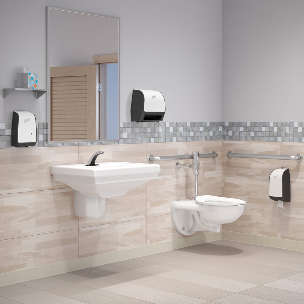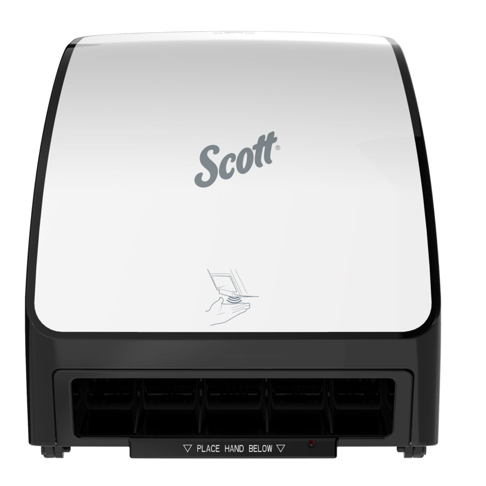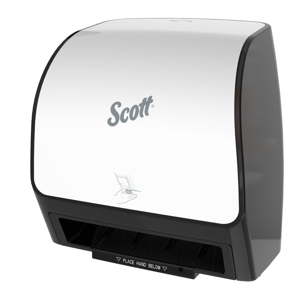 Scott® provides enhanced hygiene solutions for critical environments. With the Scott® Electronic Slimroll Dispensing System you have the benefit of a compact electronic dispenser designed to fit in tight spaces with a slim profile. The sleek design and touchless dispensing system helps to minimize the spread of dirt and germs all while providing 25% more hand dries over folded towels. The most efficient system on the market, the ultra-compact Scott® Slimroll allows you to mount the dispenser close to sinks and in tight places and keeping it close to the water helps reduce drips and slips. Simply place a hand under the dispenser to receive a nominal 10 inches of towel, a second sheet will dispense at 10% reduced length when activated within a few seconds of the first dispense. The dispenser is made of high impact plastic with translucent sides and white, opaque cover. The Slimroll Dispensing System is part of the Scott* Solutions from one of the world’s most trusted brands.