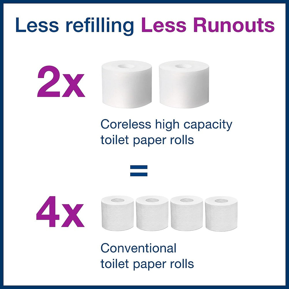 With no inner core, this system helps eliminate waste while saving storage space and reducing refill frequency. Its compact, perforated 2-ply design delivers twice the paper of conventional rolls making it ideal for high-traffic environments that prioritize performance, appearance, and environmental responsibility.