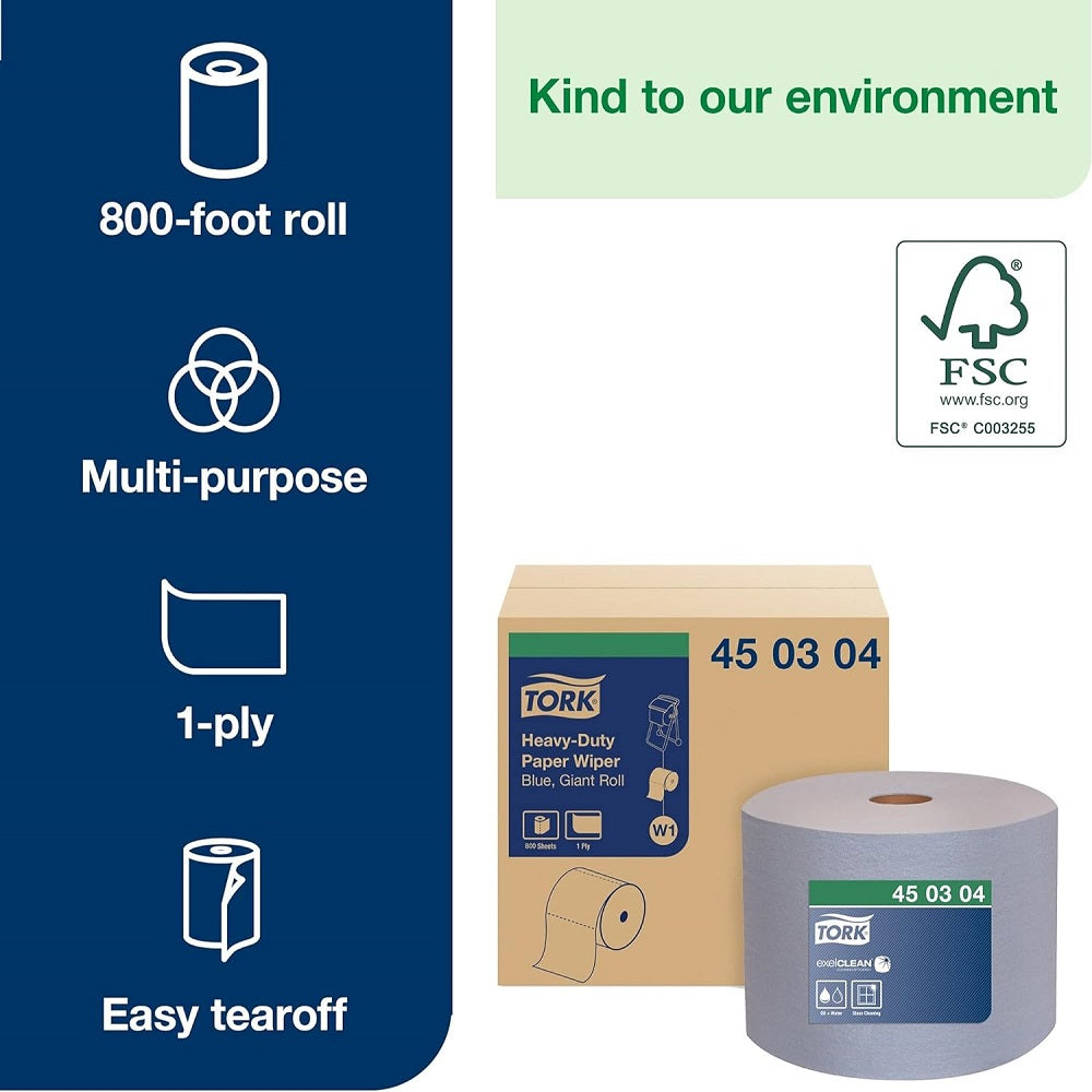 Tork® Heavy-Duty Paper Wiper, Giant Roll, 1-Ply, Blue, 800 Sheets/Roll, 450304